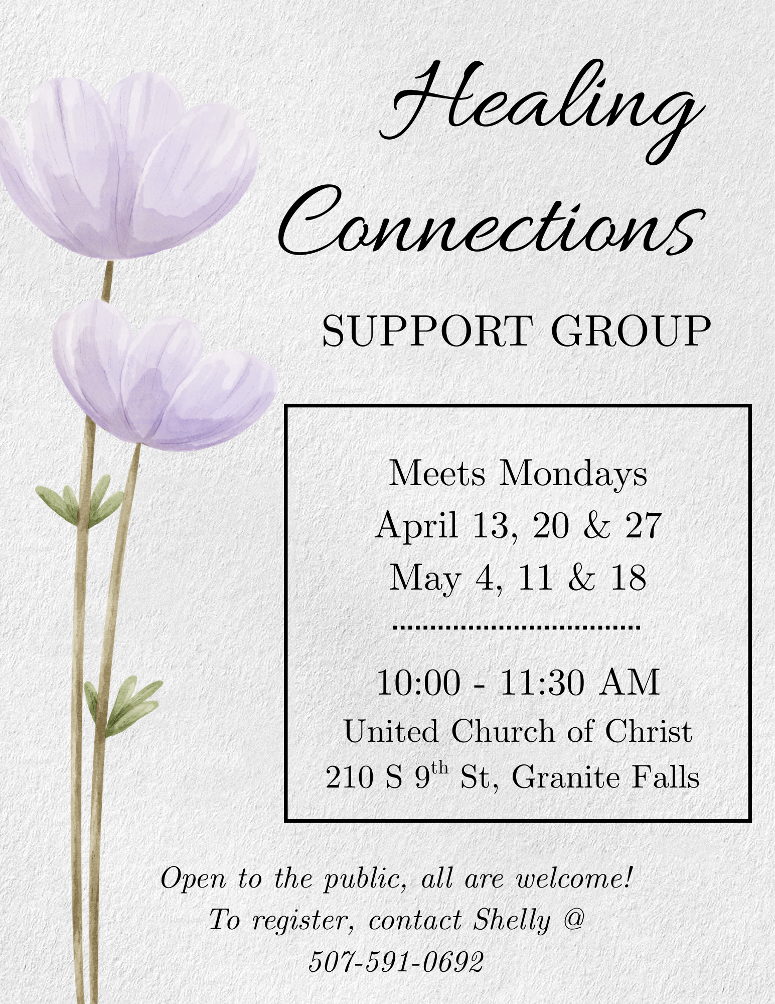 To register, you can contact Shelly from Healing Connections at 507-591-0692 or give us a call and we can get you on the list.